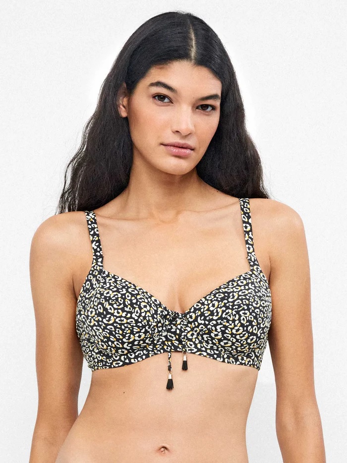 Bikini Gisela 2/30308T bikini capacidad con aro y sin foam, estampado animal print. Interior reforzado para una mayor sujeción y cordones en escote que permite ajustarlo. disponible en copa C.